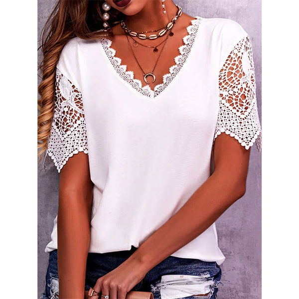 Lace Paneled Loose V-Neck Short Sleeves For Women